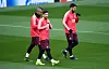 PÅ ENGELSK JORD: Lionel Messi, Arturo Vidal og Luis Suarez trente på Old Trafford tirsdag kveld.