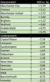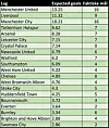 Tabellen viser at fem av de seks ventede topplagene før sesongen også er de lagene som har skapt best sjanser denne sesongen. Unntaket er Chelsea, som ved normal uttelling bare skulle ha scoret tre mål.