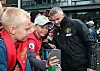 – Dette kan ta litt tid, sier pressesjef Karen Shotbolt med et smil mens Solskjær skriver autografer på draktene barna på tribunen over oss senker ned til ham langs veggen.