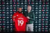 Bryan Mbeumo med sin ny drakt og Jason Wilcox.Manchester United