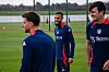 Noussair Mazraoui har kommet godt i gang med sine nye lagkamerater. Her på treningsfeltet med Mason Mount og Harry Maguire.Manchester United