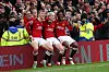 Rasmus Højlund, Alejandro Garnacho og Kobbie Mainoo feirer mål mot West Ham, med Erik ten Hag innfelt.
