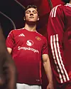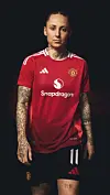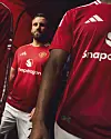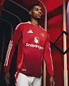«I 2024/25-sesongen viser klubbens tidløse hjemmetrøyer seg enda tydeligere frem med sterke, røde innfellinger på sidene. Denne United-drakten er laget for supporterne med fuktkontrollerende AEROREADY og brodert emblem. Dette produktet lages med 100 % resirkulerte materialer».