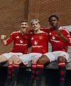 Rasmus Højlund, Alejandro Garnacho og Kobbie Mainoo poserer i den nye United-drakten.