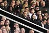 Kobbie Mainoo på tribunen sammen med lagkameratene Patrick Dorgu, Tom Heaton og Harry Maguire. Foran Mainoo sitter tidligere United-spiller Nemanja Vidic.