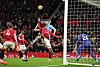 Her slår Chris Wood Leny Yoro i lufta og scorer på Old Trafford. Både United-forsvaret og keeper André Onana fikk mye kritikk i kjølvannet av det målet.