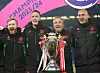 Adam Lawrence (til høyre) sammen med trenerteamet etter at United vant U18 Premier League-tittelen.
