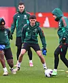 Shea Lacey har fått regelmessig treningstid med førstelaget. Her mot Kobbie Mainoo og Alejandro Garnorcho i en "Rondo"-øvelse 10. april 2024.