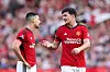 MANCHESTER, ENGLAND - OCTOBER 07: Diogo Dalot and Harry Maguire of Manchester United interact during the Premier League match between Manchester United and Brentford FC at Old Trafford on October 07, 2023 in Manchester, England. (Photo by Alex Livesey/Getty Images)Alex Livesey