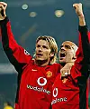 Hjemme på Old Trafford slet United noe mer, men vant likevel 3-2 etter mål av Laurent Blanc, Paul Scholes og Veron.