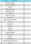 Tre andre topp seks-klubber følger på plassene rett etter – Tottenham (116), Arsenal (112) og Manchester City (109) – før bunnplasserte Huddersfield dukker opp på femteplassen med 101 endringer.