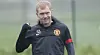 United-spillerne gjør seg klare til den daglige treningsøkten på Carrington idet et helikopter går inn for landing, et godt stykke unna, på den velstelte gressmatten.