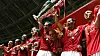 GOD STEMNING: Uniteds forsvar – minus Patrice Evra – feirer i Moskva etter kampslutt.