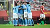 BLÅ JUBEL: Det var City-spillerne som kunne feire avansement til ligacupfinalen etter kampen på Old Trafford.